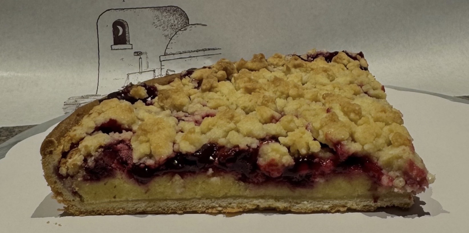 Tarte artisanale composée d’un lit de frangipane, cerises et crumble.